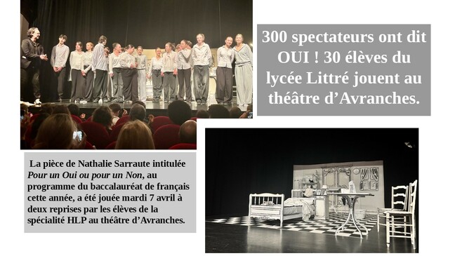 La pièce de Nathalie Sarraute intitulée Pour un Oui ou pour un Non, au programme du baccalauréat de français cette année, a été jouée mardi 7 avril à deux reprises par les élèves de la spécialité HLP au théâtre d’Avranches.