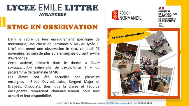 Dans le cadre de leur enseignement spécifique de mercatique, une classe de Terminale STMG du lycée E. Littré ont mené une observation in situ, ce jeudi 06 novembre, au sein de plusieurs enseignes du centre-ville d’Avranches.Cette activité, organisée par leur professeure d’économie-gestion Mme Vanpoucke, s’inscrit dans le thème « Toute consommation crée-t-elle de l’expérience ? » du programme de terminale STMG.